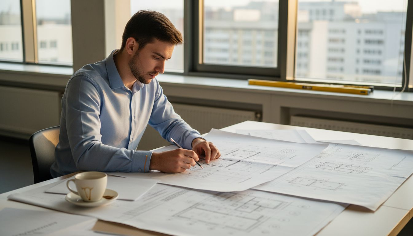 Statybų projektų vadovas biure dažnai analizuoja ir tvarko brėžinius, planuodamas tolimesnius darbus.